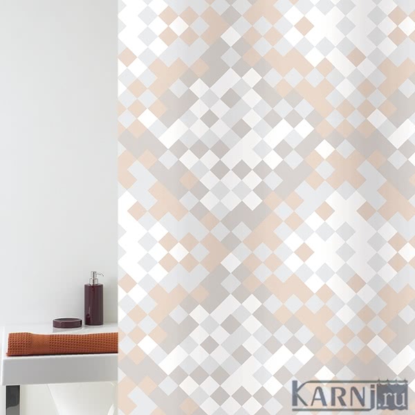 Занавеска из 100% полиэстера для ванны с 16 люверсами под кольца. Штора обработана специальной пропиткой, отталкивающей воду. Внизу по всей длине вшит шнур-утяжелитель.